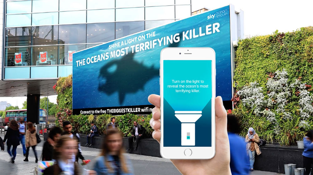 Uma combinação entre painel, digital out of home (DOOH) e mobile resultou numa ação surpreendente. Para marcar o Dia Mundial dos Oceanos – comemorado em 8 de junho, desde 1992 -, a Sky veiculou, em 2017, a campanha “The Ocean’s Most Terrifying Killer” (“O matador mais assustador do Oceano”, numa tradução livre). Por meio da mídia out of home, a iniciativa levou conscientização sobre o uso indevido e descarte de plástico nas águas de todo o planeta, causando destruição e prejudicando os animais marinhos.